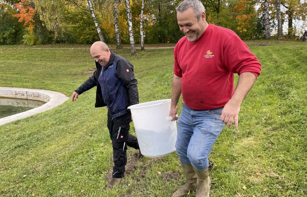 Unsere Gewässerwarte Holger und Hans nehmen jeweils die frische Lieferung Salmoniden in Empfang und bringen sie – mit Hilfe von Freiwilligen – rasch eigenhändig ins Wasser.